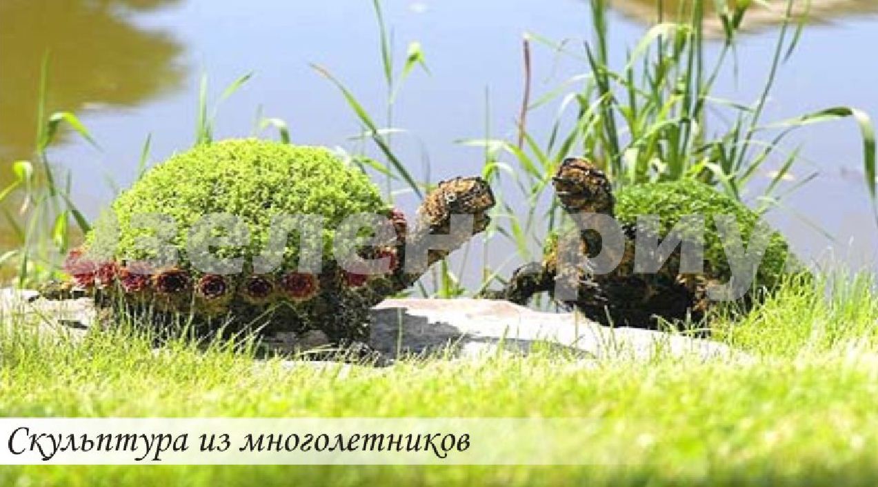 - Каркасные скульптуры – декоративные конструкции сложных форм на основе прочного скрытого растениями каркаса, имеющие тематическую сюжетную направленность, различных размеров. Могут быть стационарными или мобильными. Каркасная конструкция выстилается пленочным материалом и заполняется легким питательным субстратом на основе смеси торфа, навоза и сфагнума или соломы (в соотношении 1 : 1 :2 ) с созданием при необходимости дренажа (керамзит и др.). Растения высаживают в ячейки каркаса, предварительно прорезая пленку. В наиболее сложных конструкциях может быть предусмотрена система внутреннего полива в виде сети перфорированных трубок с мелкими отверстиями с геотекстильной изоляцией.