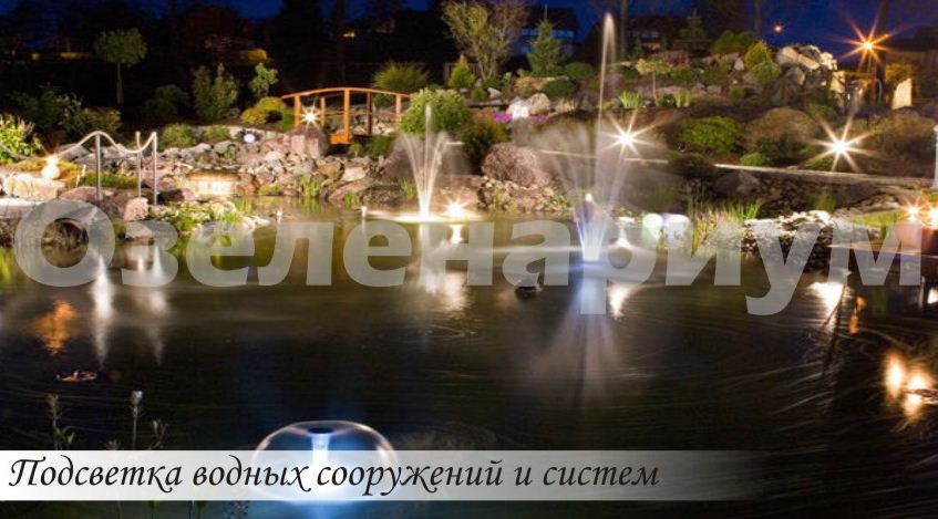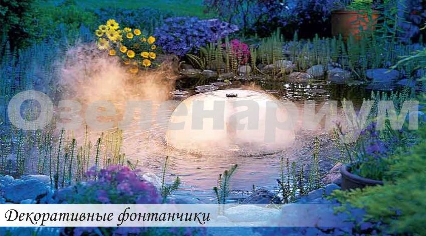 На дне водоема может устанавливаться насос, посредством которого на поверхности воды будет функционировать фонтан. Также можно устраивать декоративные ручейки и каскады с помощью установки специального оборудования. Для дополнительного декорирования применяются туманообразующие установки и подсветка, требующие запитки от электросети.