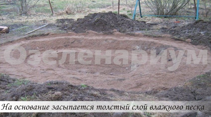 - Подготовка основания. Почва котлована уплотняется, на дно засыпается влажный песок слоем около 3–5 см;