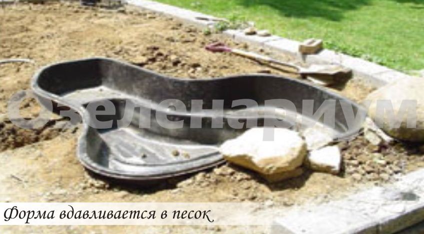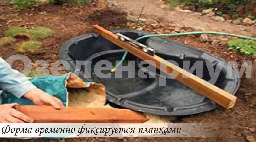 - форму фиксируют планками, установленными в зазор между стенками котлована и формой, и постепенно заполняют водой, одновременно подсыпая вокруг формы по контуру котлована песок.