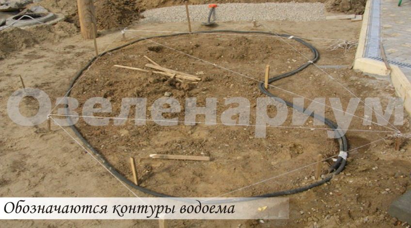 - Обозначение контуров. Колышками намечаются границы выкапываемого основания;