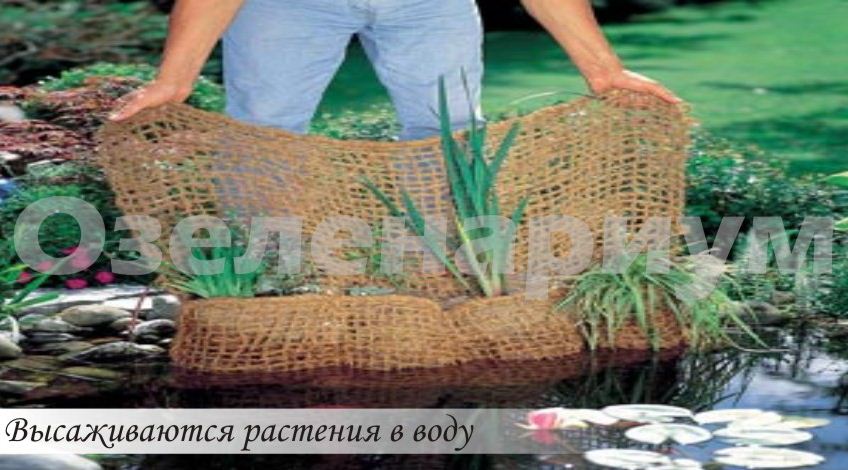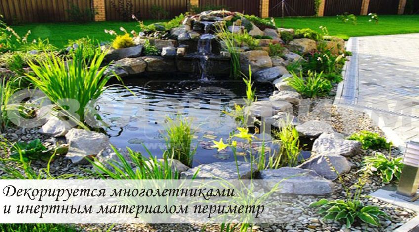 - Завершающий этап. Высаживаются растения в контейнерах на ступеньки-террасы, по краям берегов водоема. Укладываются инертные материалы.