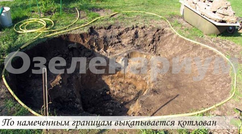 - Выкопка формы. По намеченным границам выкапывается котлован, по краям которого вырезаются ступени – террасы (30 – 40 см по ширине), удаляются камни и растительные остатки;