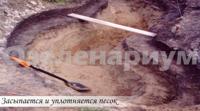 - котлован повторяет контур жесткой формы, но несколько больших размеров (шире формы по контуру на несколько десятков сантиметров и глубже ее приблизительно на 5 см), на дно которого так же засыпается песок слоем 5 см;
