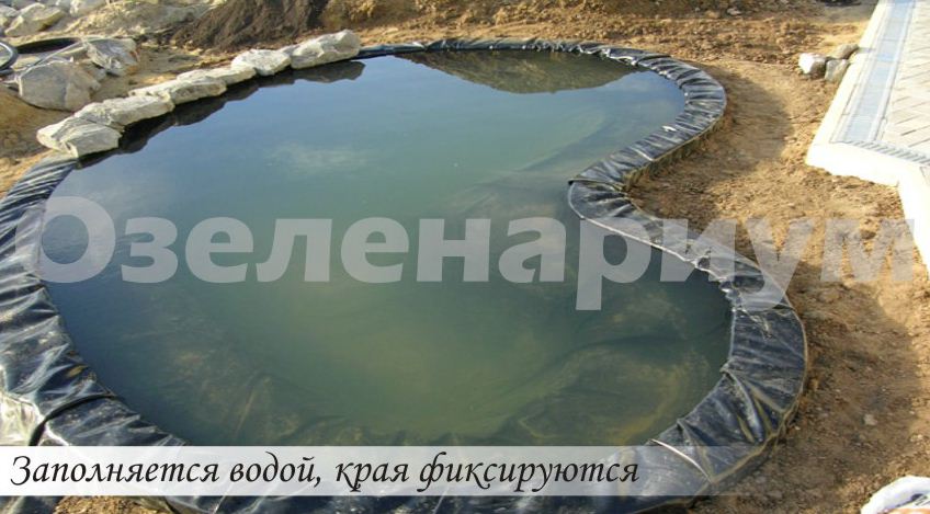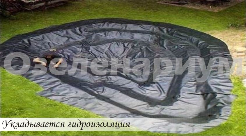 - Гидроизоляция. На песок укладывается гидроизоляционное покрытие и заполняется водой, давая пленке опуститься, приняв форму водоема. Обрезают излишки покрытия, оставив около 15 см по контуру водоема, закладывают складки и фиксируют края металлическими шпильками;