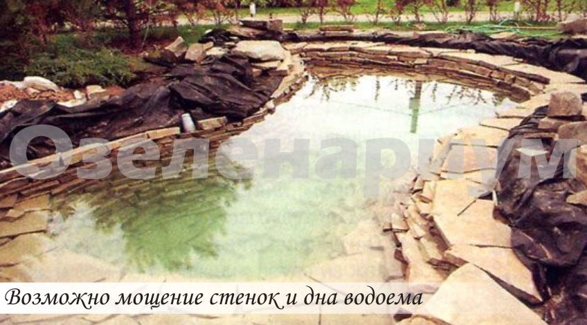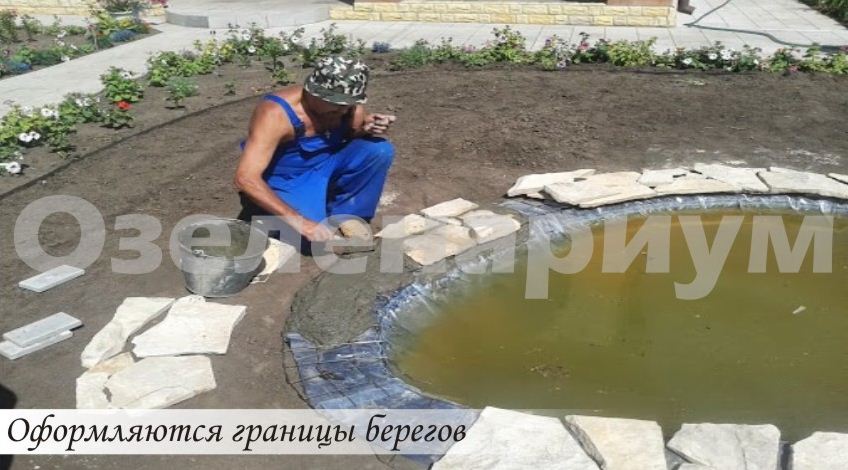 - Оформление контура водоема. Мощение из камня или бетонной плитки на растворе так, чтобы мощение на 3–5 см нависало над поверхностью воды, при необходимости маскируются видимые фрагменты пленки галькой или щебнем;