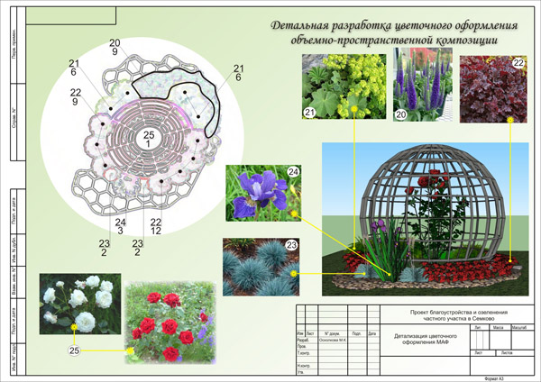 Детальная проработка цветочного оформления подразумевает подбор цветочных растений согласно условиям произрастания, освещенности, месторасположения, выступающих в качестве самостоятельного элемента (солитеры) либо в составе более сложных композиций (партеры, арабески, альпинарии, рокарии, рабатки, миксбордеры и т.д.). Это могут быть ароматные розарии в совокупности с другими пряно-ароматическими травами, а возможно и декоративные лужайки спокойных монохромных тонов. Также могут быть представлены композиции в емкостях –декоративные растения в контейнерах, вазах и т.п. различной формы и объема стационарного или мобильного типа. Они бывают подвесными (на светильниках, деревьях и т. п.), настенными (на подоконниках и стенах), напольными, в которых обычно размещают объемные растения, а при достаточной высоте контейнера их дополняют ампельными цветочно-декоративными культурами. Каждая цветочная композиция подбирается с учетом календарных сроков цветения, чтобы глаз радовался в любой день сезона. Также учитываются высота растений, декоративность (красивоцветущие или декоративнолиственные), зимостойкость и совместимость с другими культурами.
