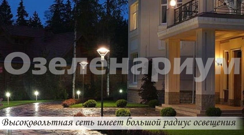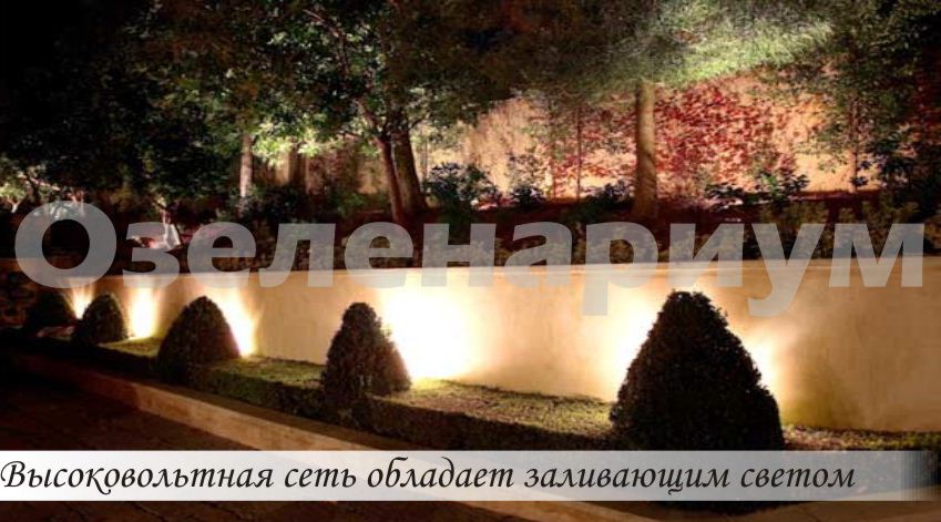 Высоковольтная сеть обычно применяется для масштабного освещения дома или участка. Каждый источник света охватывает значительный радиус и отличается ярким заливающим светом. С применением такой сети обычно освещают беседки, фасады построек, заборы, входные зоны, общий фон участка или отдельные крупные элементы (высокие деревья, большие кустарники, скульптуры и т.д.).