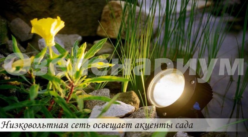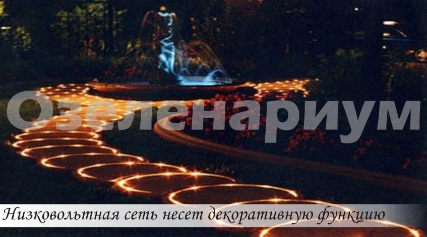 Сеть пониженного напряжения применяется для конкретных декоративных целей, а не для эксплуатационных. Такая сеть предназначения для выделения более мелких объектов сада – низкорослых кустарников, цветников или камешков, фонтанчиков и каскадиков.