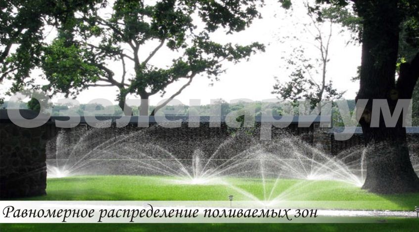 Зоны представляют собой отдельные участки, поливаемые группой спринклеров (поливных головок). Эти участки выбираются на основании потребности во влаге отдельного ландшафтного модуля или части газона. Такое зонирование позволяет разработать оптимальный расход воды на весь участок и предотвратить сухие не поливаемые места.