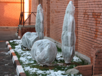 В целях более серьезной защиты применяется нетканый материал (спанбонд), которым оборачивается весь кустарник или дерево, дабы избежать повреждений и ожогов (преимущественно для молодых посадок и хвойных кустарников) зимой и ранней весной.